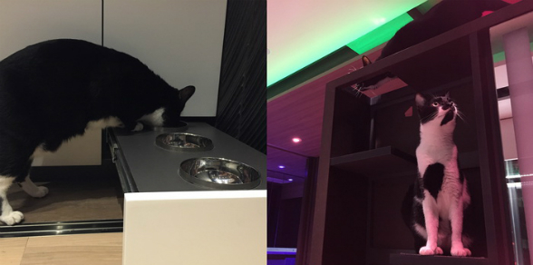 Para estos se diseñó una escalera de juego, una pasarela en el perímetro del techo, una caja de arena escondida con un sistema de ventilación, en la cocina una bandeja para alimentarlos, entre otros.