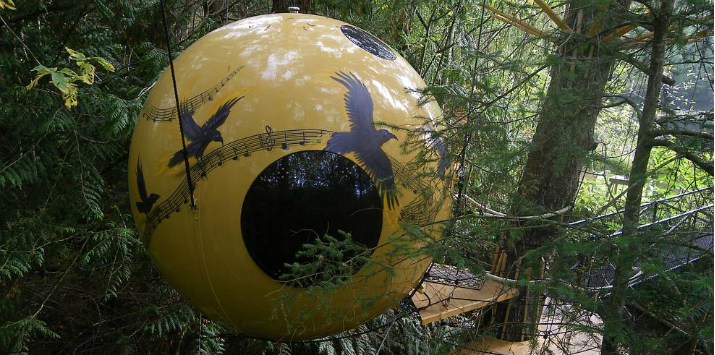 Free Spirit Spheres. Este magnífico hospedaje dispone de tres habitaciones esféricas diseñadas en madera y enganchadas a los árboles en un bosque de Vancouver, Canadá.