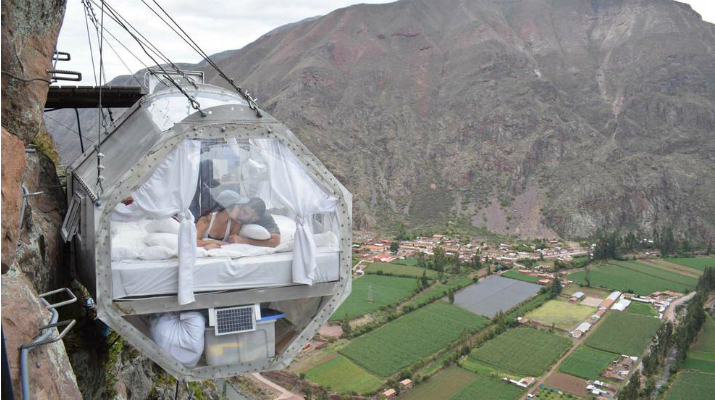 Skylodge Adventure Suites. Si te gusta lo extremo este Hotel en Urubamba, Perú es una excelente opción para ti. Es una cápsula transparente que está suspendida en lo alto de un abismo. Para llegar hasta allí se debe escalar 400 metros o caminar por un sendero. Cada suite incluye cuatro camas, un comedor y un baño.