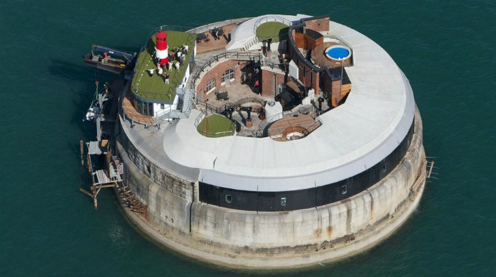 Spitbank Fort. Este hotel está en Portsmouth, Reino Unido. Cuenta con ocho suites de lujo, un bar, una piscina de agua caliente, y una increíble vista. Simula una isla privada en medio del mar.