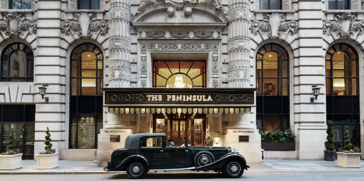 Diseñado y construido en estilo neoclásico en 1905. Hace parte de la cadena de hoteles de lujo Peninsula Hotel Group con sede en Hong Kong. Está estratégicamente ubicado en la Quinta Avenida y la calle 55, en el centro de Manhatan, a pasos de Central Park, Rockefeller Center, restaurantes, museos y los teatros de Broadway.