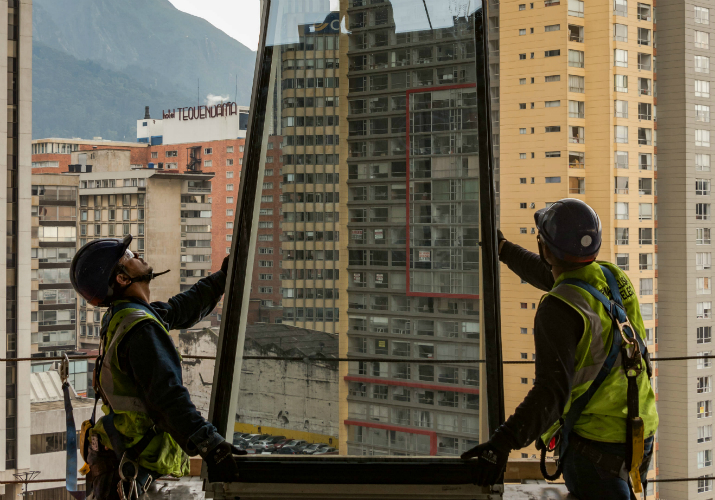 El proceso de instalación de la fachada envolvente lleva ya siete meses. A partir del nivel 8, donde los pisos son repetitivos, la programación contempla instalar 160 paneles semanales, correspondiente al 96 % de un piso. El 4 % faltante es la franja de tres elevadores de carga y personal para el transporte vertical. Se deben acopiar semanalmente 60 guacales en su respectivo piso evitando congestión en el Nivel 0.