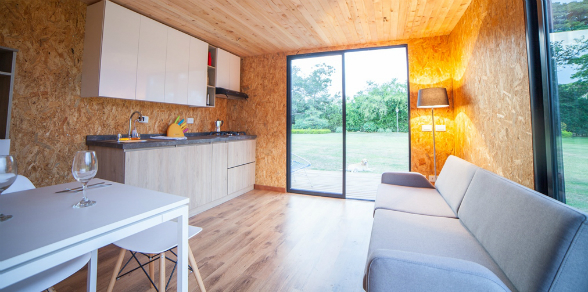 En la vivienda predomina el uso de la madera, con paredes fabricadas en panel OSB -hechos a partir de restos de madera y soportan la humedad, el calor y el fuego-.