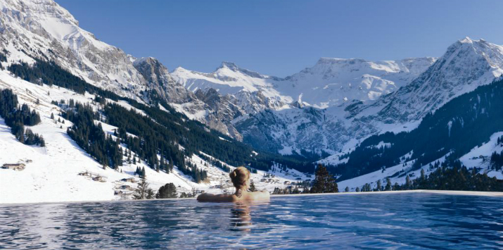 1. La grandiosa piscina climatizada se encuentra ubicada en los Alpes suizos en el hotel The Cambrian, tiene vista hacia las montañas cubiertas de nieve, está equipada con chorros de masajes para relajar los músculos de los deportistas que van a las montañas a esquiar.