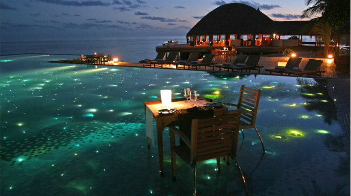 3. La maravillosa piscina de agua salada fue la primera en usar fibra óptica, se encuentra en la isla turística privada Huvafen Fushi, en Maldivas. 1.000 luces pequeñas la iluminan y ha sido escenario de importantes eventos como desfiles de moda internacionales. Sus aguas son reconocidas por contener minerales terapéuticos.