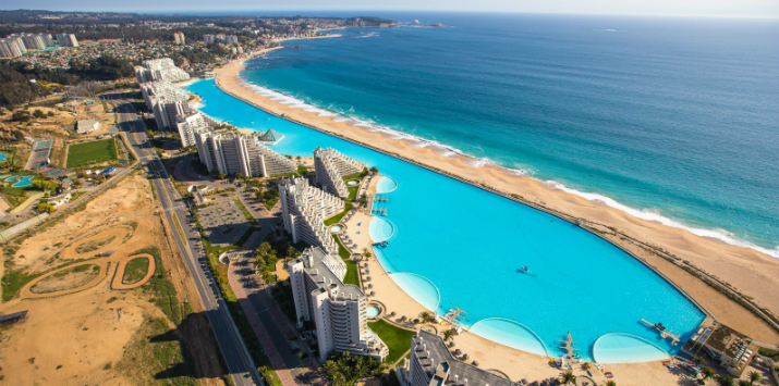 2. Esta gigantesca piscina está ubicada en Algarrobo, Región de Valparaíso, Chile, a orillas del Océano Pacífico en un extenso complejo residencial. La piscina tiene 1.013 metros de largo y hasta 35 metros de profundidad. Los 250 millones de litros de agua que contiene son extraídos directamente del mar.