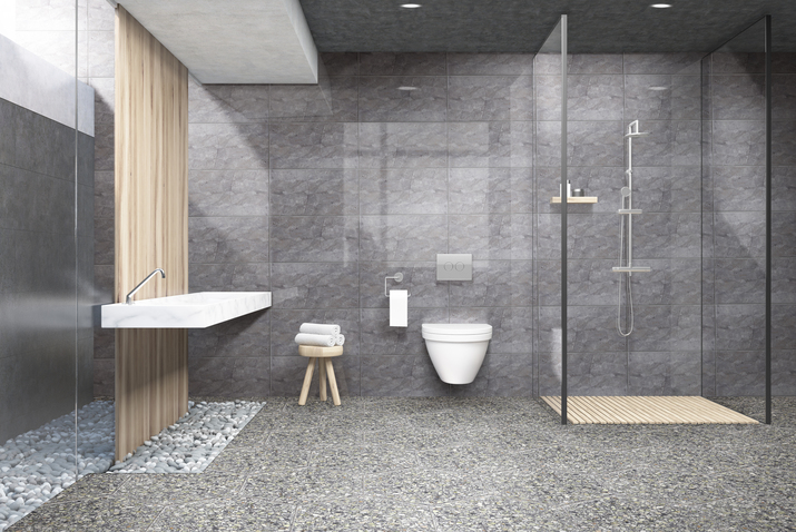 6. Para los baños grandes se pueden utilizar colores oscuros como el negro, el gris en todas sus variantes, azul navi, café y terracotas. También se recomienda usar piezas en acabado mate, instalaciones con formatos más pequeñas, diseños más cargados, etc. Todos estos consejos hacen ver un poco más pequeño y acogedor ese espacio tan especial. En general el tamaño nos dice qué tanto diseño admite un baño, los pisos del tipo cuadriculado, los patrones escalonados tipo espina de pescado, son diseños ideales para espacios amplios.