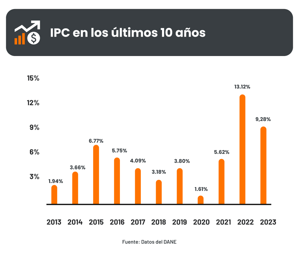 En Colombia, durante el año 2023, se registró una tasa inflacionaria anual del 9,28%, reflejando un crecimiento considerable en el nivel general de precios.