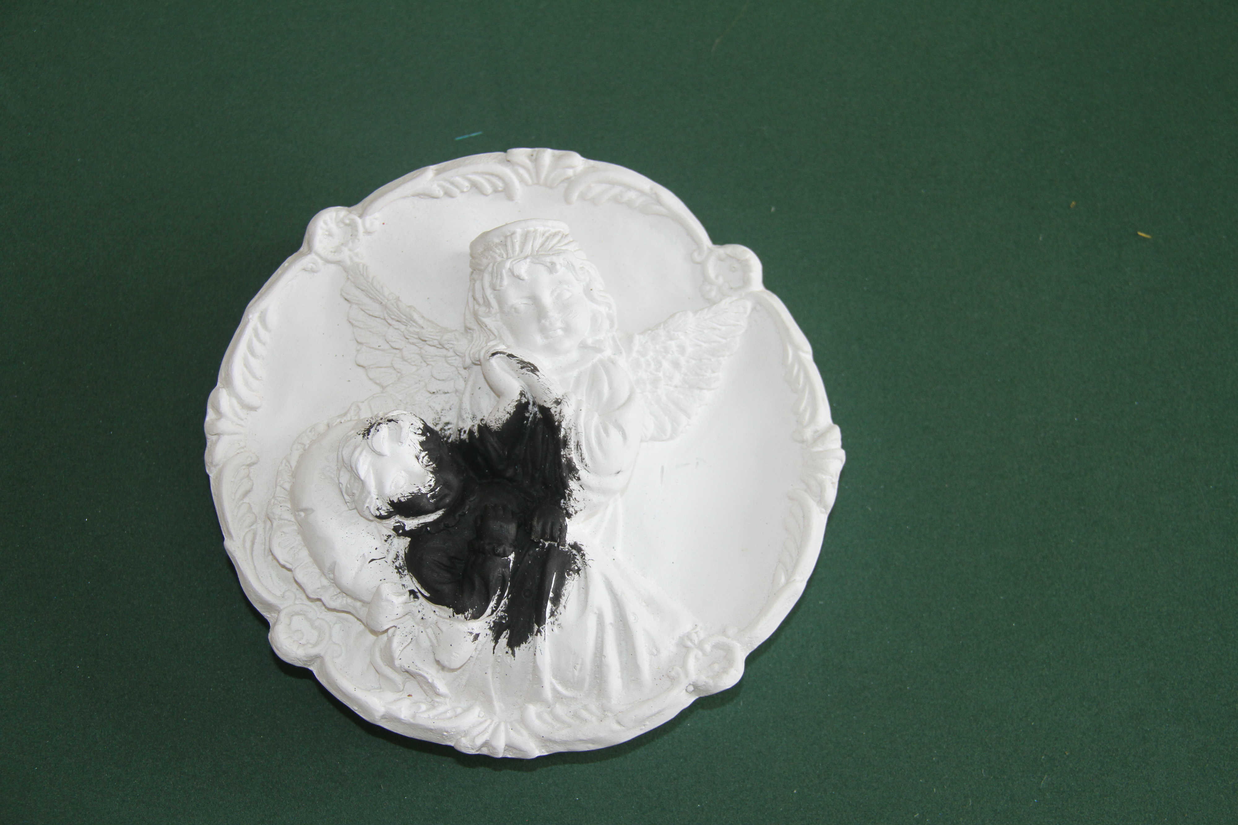 En la paleta de pinturas agregar el acrílico negro disuelto con poco de agua; luego se inicia a pintar toda la pieza de yeso de color negro; se recomienda aplicar mínimo tres capas y dejar secar por varios minutos.