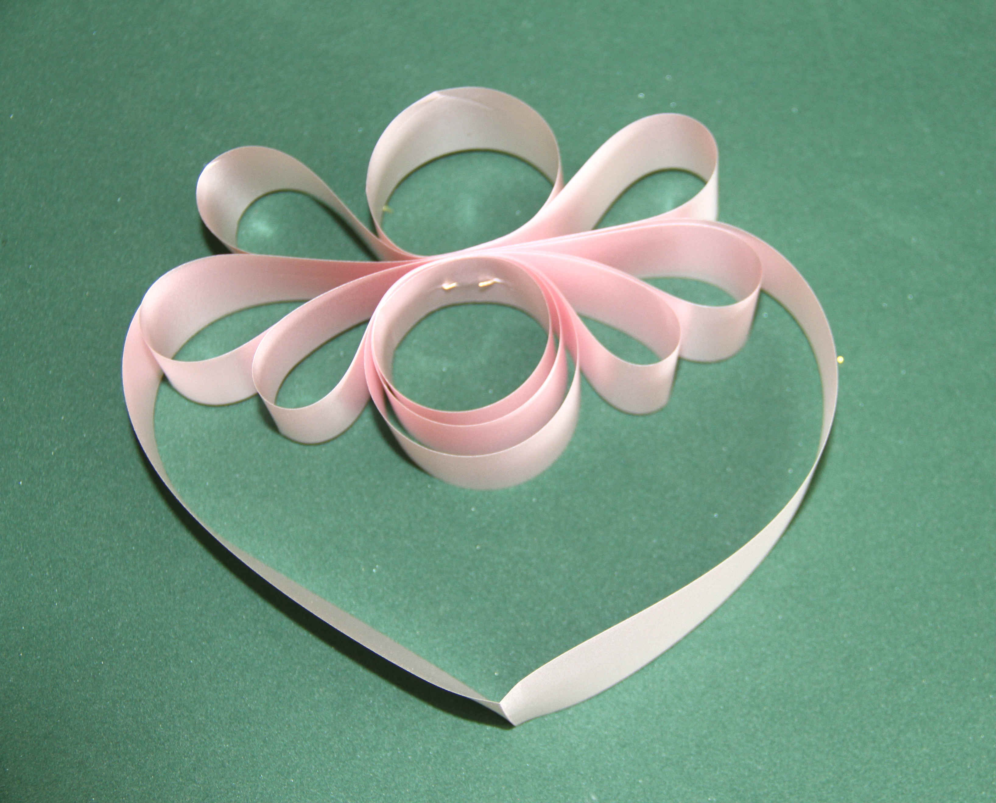 Moño corazón, se hace una armella inicial con la cinta de papel, luego se realiza otra armella más grande y separada de la inicial dejando un espacio de un centímetro entre armella para que se vea bien la forma, después se va a realizar una armella más y cuatro ‘orejas’, ahí quedará otro moño básico, se le da la vuelta para que dé como si fuera un ‘circulo’, se grapa y se corta la cinta sobrante.